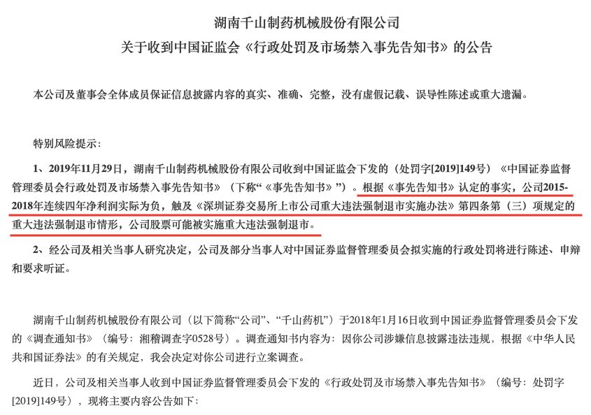 12月2日晚间,千山药机公告称,收到证监会的《行政处罚及市场禁入事先告知书》,根据认定事实,公司2015-2018年连续四年净利润实际为负,触及重大违法强制退市情形,可能被实施重大违法强制退市。