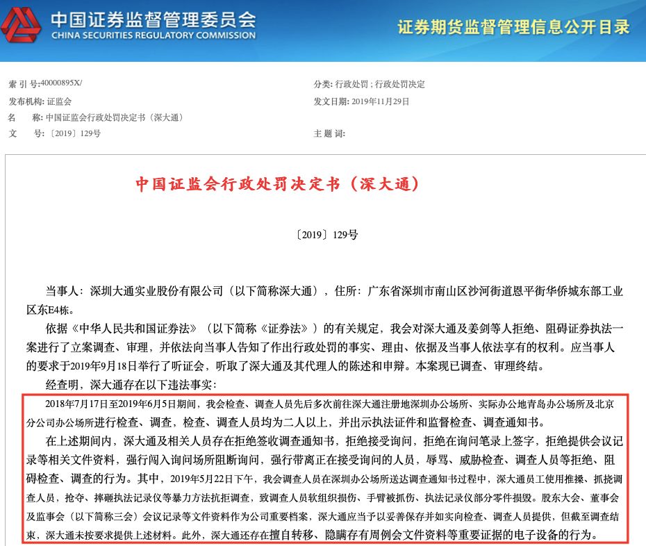 据了解,在2018年7月17日至2019年6月5日期间,证监会工作人员先后多次前往深大通办公场所进行检查、调查,深大通及相关人员存在拒绝签收监督检查、调查通知书,拒绝检查、调查人员进入办公场所,拒绝接受询问,拒绝在询问笔录上签字,拒绝提供会议纪要等相关文件资料,强行闯入询问场所阻断询问,强行带离正在接受询问的人员,辱骂、威胁检查、调查人员等拒绝、阻碍检查、调查的行为。