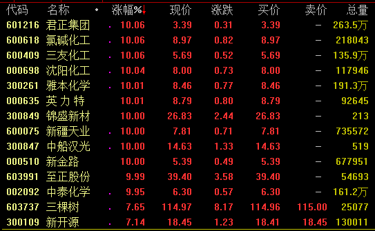 化工板块15日盘中快速拉升走高,截至发稿,君正集团、氯碱化工、三友化工、沈阳化工、雅本化学、英力特、中泰化学等涨停。