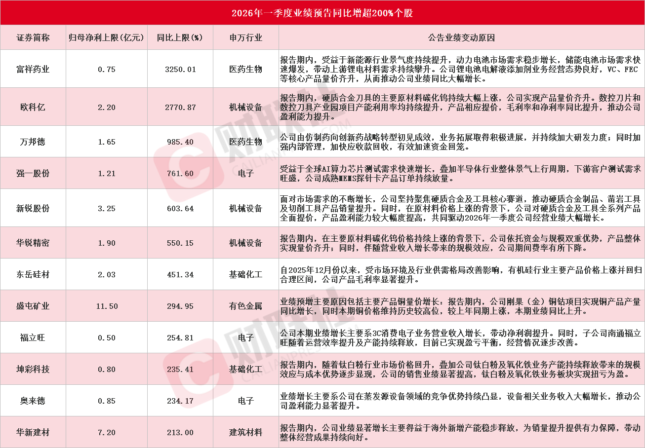据财联社不完全统计,截至发稿,共有36家A股上市公司发布2026年一季度业绩预告。其中,12只个股净利润同比预增上限超200%,分别为,富祥药业、欧科亿、万邦德、强一股份、新锐股份、华锐精密、东岳硅材、盛屯矿业、福立旺、坤彩科技、奥来德、华新建材(具体情况见下图)。此外,德明利、博汇股份、维尔利等预计一季度实现扭亏为盈。