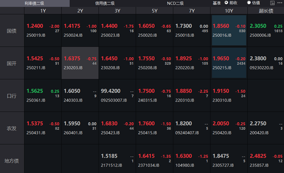 银行间主要利率债收益率多数下行,截至下午16:30分,10年期国债活跃券250016收益率下行0.1bp报1.856%,10年期国开债活跃券250215收益率下行0.2bp报1.965%,30年期国债活跃券2500006收益率上行0.25bp至2.305%。