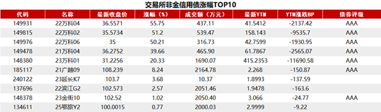 交易所债券市场收盘,据Choice 数据统计显示,今日交易所市场非金信用债涨幅排行前五的分别是:22万科04、22万科02、22万科06、21万科04、23万科01。具体如下:
