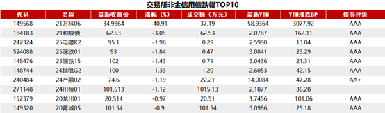 据Choice 数据统计显示,今日交易所市场非金信用债跌幅排行前五的分别是:21万科06、21和县债、25电建K2、25深铁01、23深铁15。具体如下: