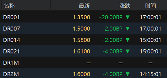银行间回购定盘利率全线下跌。FR001跌10.0个基点报1.43%;FR007跌5.0个基点报1.55%;FR014跌1.0个基点报1.62%。