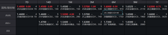 一级存单方面,今日3M国股在1.58%-1.62%位置需求较好,1Y期国股报在1.62%-1.66%的位置。二级存单方面,6M国股成交在1.6000%附近(较前一日下行0.5BP),1Y国股成交在1.6300%的位置(较前一日下行0.75BP)。