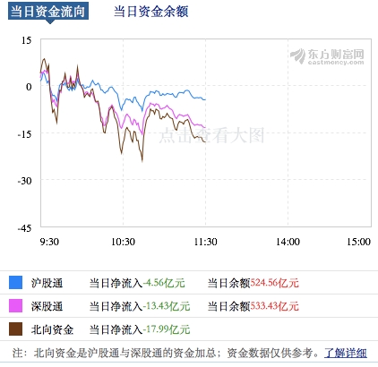 北向资金呈现净流出态势。据东方财富数据,截至午间收盘,北向资金半日净流出17.99亿元,其中沪股通资金净流出4.56亿元,深股通资金净流出13.43亿元。