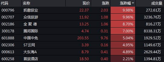 在涨幅居于首位的休闲服务板块中,凯撒旅业、众信旅游、ST云网涨停,全聚德、腾邦国际、中国中免等涨幅超5%。