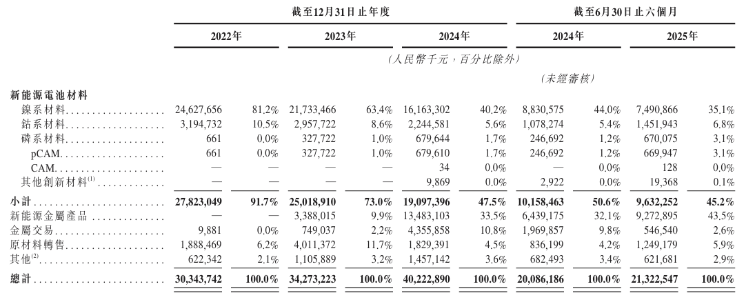 2022年至2024年,公司核心业务和主要收入来源始终是新能源电池材料中的镍系材料,2022年时达到81.8%的占比,后续逐渐降低但稳定在40%以上;同时新能源金属产品取得收入占比逐渐提高,直至2025年6月30日为止,新能源金属产品收入占比达到43.5%,接近新能源电池材料的45.2%。