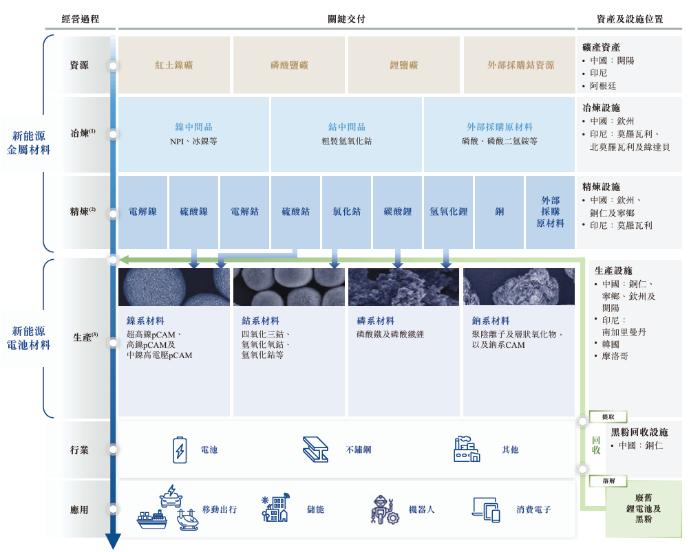 公司核心业务为正极活性材料前驱体(pCAM),涵盖镍系、钴系、磷系及铜系等多种新能源电池材料,同时向上游延伸至新能源金属的开采、冶炼、精炼及回收环节。直接及间接客户主要为全球新能源材料、电池、汽车及消费电子行业的领先企业,供应商主要是原材料、设备及工程服务供应商。