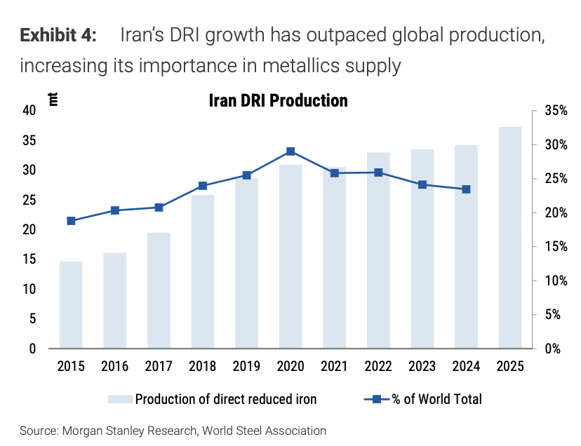 伊朗是全球主要的直接还原铁(DRI)供应国,2025年生产了约3700万吨直接还原铁,占全球总产量的25%。