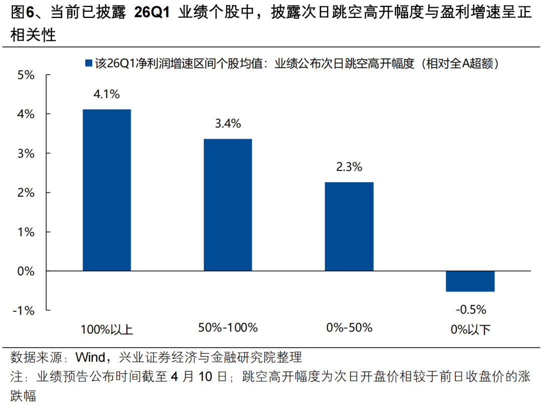此外,随着一季报业绩预告密集披露期开启,市场开始对景气个股给予积极定价,依据景气自下而上选股的有效性也在增强。进入一季报业绩预告密集披露期,截至4月10日,已有91家A股上市公司披露26Q1业绩(含预告、快报)。当前已披露业绩个股中,业绩披露次日跳空高开的幅度与其盈利增速明显正相关,表明市场开始对景气个股给予积极定价。随着风险偏好修复、内部景气线索增多,后续依据内部景气自下而上选股的有效性也将逐渐增强。当前来看,26Q1披露业绩增速较高、市场定价较为积极的领域主要集中在电子(PCB、存储、国产算力)、新能源、有色(铝、黄金、能源金属)、化工、医药、机械设备(数控刀具、工程机械),以及水泥、啤酒、券商等细分方向。