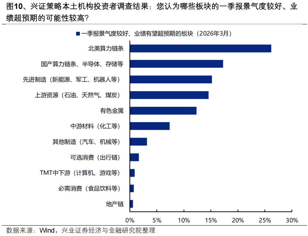 根据该行3月23日至25日针对260+位本土核心投资机构的基金经理、投研负责人与总量研究员的调查结果,当前机构投资者对算力链、先进制造与上游资源一季报景气共识较强。当前机构投资者对一季报业绩共识最强的高景气方向是北美算力链条(26%),其次为国产算力链条、半导体、存储等(17%)、先进制造(新能源、军工、机器人等)(15%)、上游资源(石油、天然气、煤炭)(15%)和有色金属(12%)。