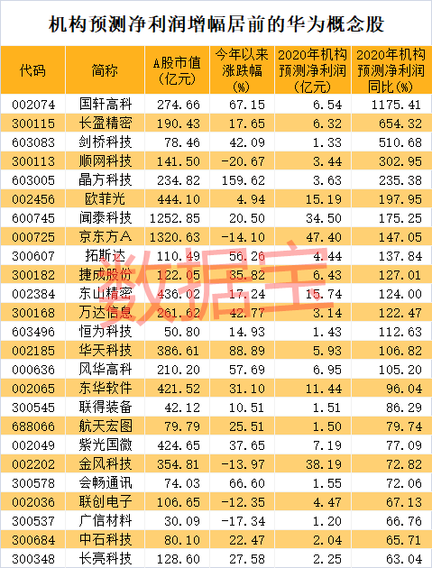 证券时报·数据宝统计显示,当前华为概念股数量已增至330只以上,A股市值合计超4.6万亿元。根据5家以上机构一致预测数据,15只华为概念股今年净利润预测增幅有望翻倍,如国轩高科、长盈精密、剑桥科技、顺网科技、晶方科技等。