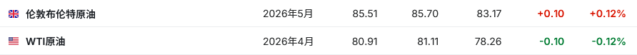 截至发稿,布伦特原油期货涨0.12%,报85.51美元/桶;WTI原油期货跌0.12%,报80.91美元/桶。