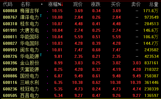 电力板块今日盘中大幅拉升,截至收盘,梅雁吉祥、漳泽电力、桂东电力、大唐发电、华能国际、华电国际、闽东电力、华电能源等涨停。