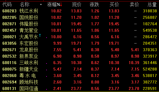 水利板块今日盘中快速拉升走高,截至收盘,钱江水利、国统股份、伟隆股份、青龙管业、大禹节水、东宏股份等涨停,龙泉股份、新界泵业、三峡水利等涨幅超6%。