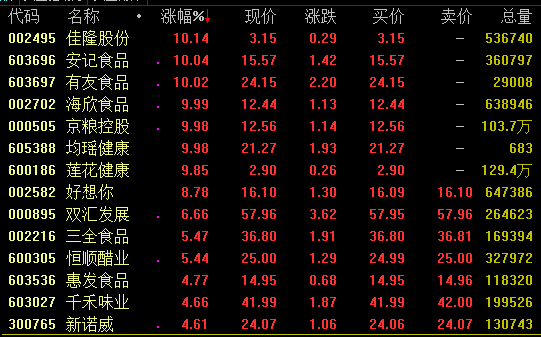食品饮料板块今日盘中再度发力拉升,截至收盘,佳隆股份、安记食品、有友食品、海欣食品、京粮控股、莲花健康等涨停。值得注意的是,千禾味业、恒顺醋业、三全食品、安井食品、涪陵榨菜、洽洽食品、海天味业、安井食品等再创新高。