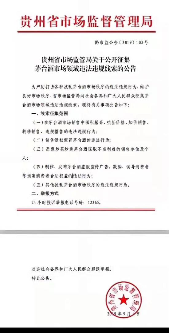 9月1日,贵州省市场监督管理局下发《贵州省市场监管局关于公开征集茅台酒市场领域违法违规线索的公告》【黔市监(2019)103号】文件,为严厉打击各种扰乱茅台酒市场秩序的违法违规行为,维护良好市场秩序,(贵州)省市场监管局向社会各界和广大人民群众征集茅台酒市场领域违法违规线索。