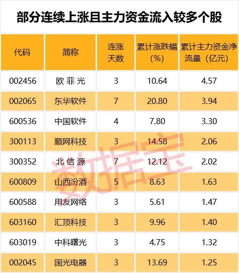 值得注意的是,127只连续上涨个股中,13只个股期间主力资金累计净流入超过亿元。其中,累计资金流入最多的为欧菲光,主力资金累计流入4.57亿元。