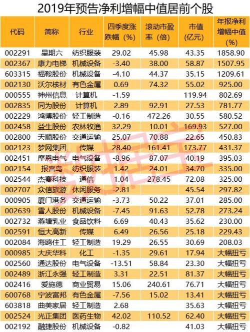 22股净利润预告增幅中值超200%或大幅扭亏,星期六成为“预增王”,预告净利增幅中值高达1858.9%;其他增幅中值较高的还康力电梯、福鞍股份,净利预告增幅中值都超过10倍。