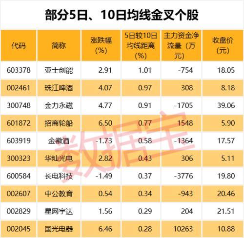最新数据显示,有21只A股的5日均线主动上穿10日均线,其中亚士创能、珠江啤酒、金力永磁等个股的5日均线较10日均线距离最大,分别达1.01%、0.97%、0.91%。