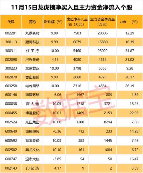 11月15日龙虎榜中机构及营业部席位资金净卖出0.31亿元,其中净买入的个股有19只;净卖出的个股有18只。净买入前三名个股分别是九鼎新材、顺网科技、任子行等,净买入金额占当日成交额比例达4.43%、6.27%、7.61%。