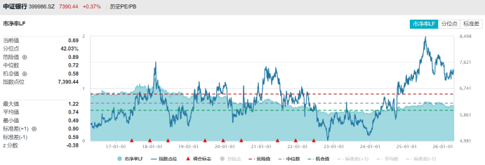 从市净率数据上看,截至今日收盘,目前所有银行股均处于破净状态。其中,宁波银行、杭州银行、招商银行、农业银行市盈率稍高,均在0.9倍以上,而民生银行、贵阳银行、华夏银行、郑州银行、光大银行目前市盈率均不足0.4倍。以整个板块统计,中证银行指数目前市净率0.69倍,处于近十年42.03%分位。