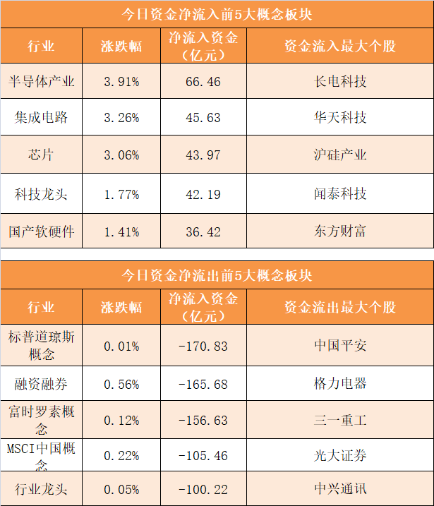 概念板块方面,今日半导体产业、集成电路、芯片、科技龙头等概念板块资金呈现净流入,其中半导体产业概念净流入66.46亿元居首。