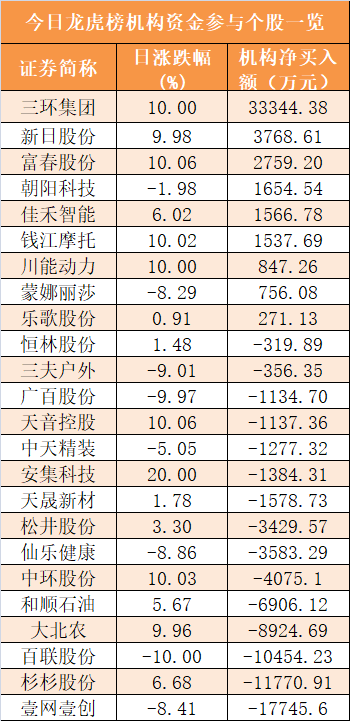 盘后龙虎榜数据显示,机构现身24股,其中三环集团等9股呈现机构资金净买入,壹网壹创等15股呈现机构资金净卖出。