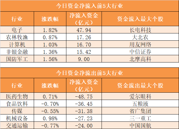28个申万一级行业中,6个行业实现资金净流入,其中电子行业净流入47.94亿元居首。