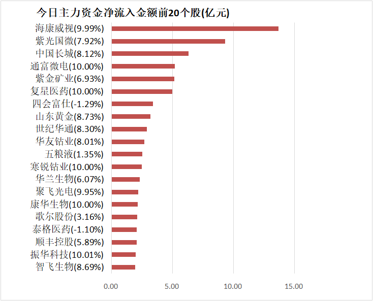 5.海康威视主力资金净流入13.67亿元居首