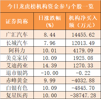 盘后龙虎榜数据显示,机构现身9股,其中广汇汽车等5股呈现机构资金净买入,复星医药等4股呈现机构资金净卖出。