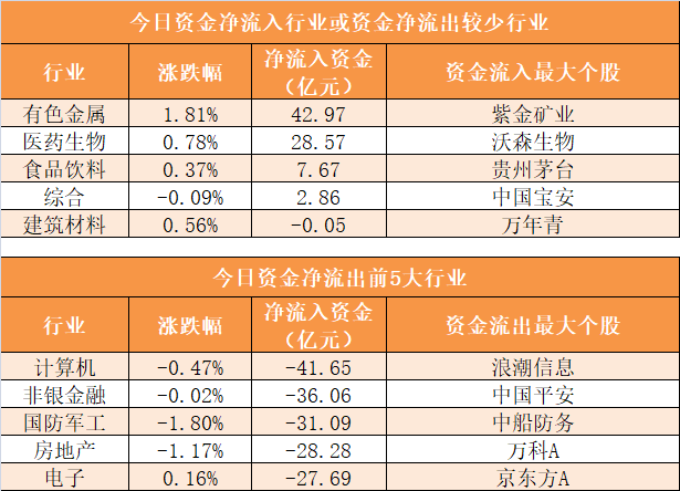 28个申万一级行业中,4个行业实现资金净流入,其中有色金属行业净流入42.97亿元居首。