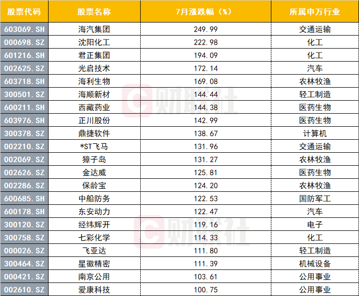 从个股涨幅榜上可以看出,本月两市涨幅最大的个股为海汽集团,月涨幅近250%,居于两市个股涨幅榜首位,该股走强的主要刺激因素是具备免税概念,该公司7月30日晚间公告称,间接控股股东已上报免税品经营资质申请。此外,医药生物及化工板块成为7月孕育牛股的温床,西藏药业及沈阳化工等表现不俗。