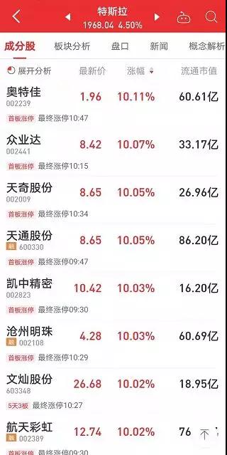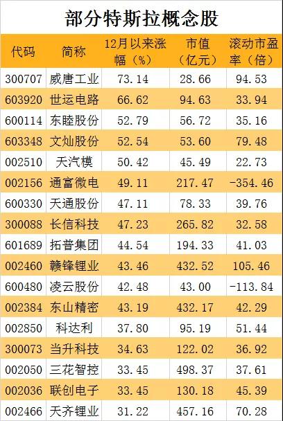 今日早盘,天通股份、中国宝安、世运电路等近10只特斯拉概念股涨停。证券时报•数据宝统计显示,自2019年12月以来,特斯拉概念股平均上涨22%,其中威唐工业、世运电路、东睦股份、文灿股份、天汽模涨幅居前,上涨幅度均超50%。