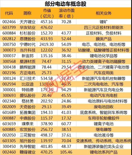 电动车的发展会增添相关产业链的景气度,相关概念股将受益。数据宝结合市场上公开信息及部分研报数据,梳理电动车产业链相关概念股。