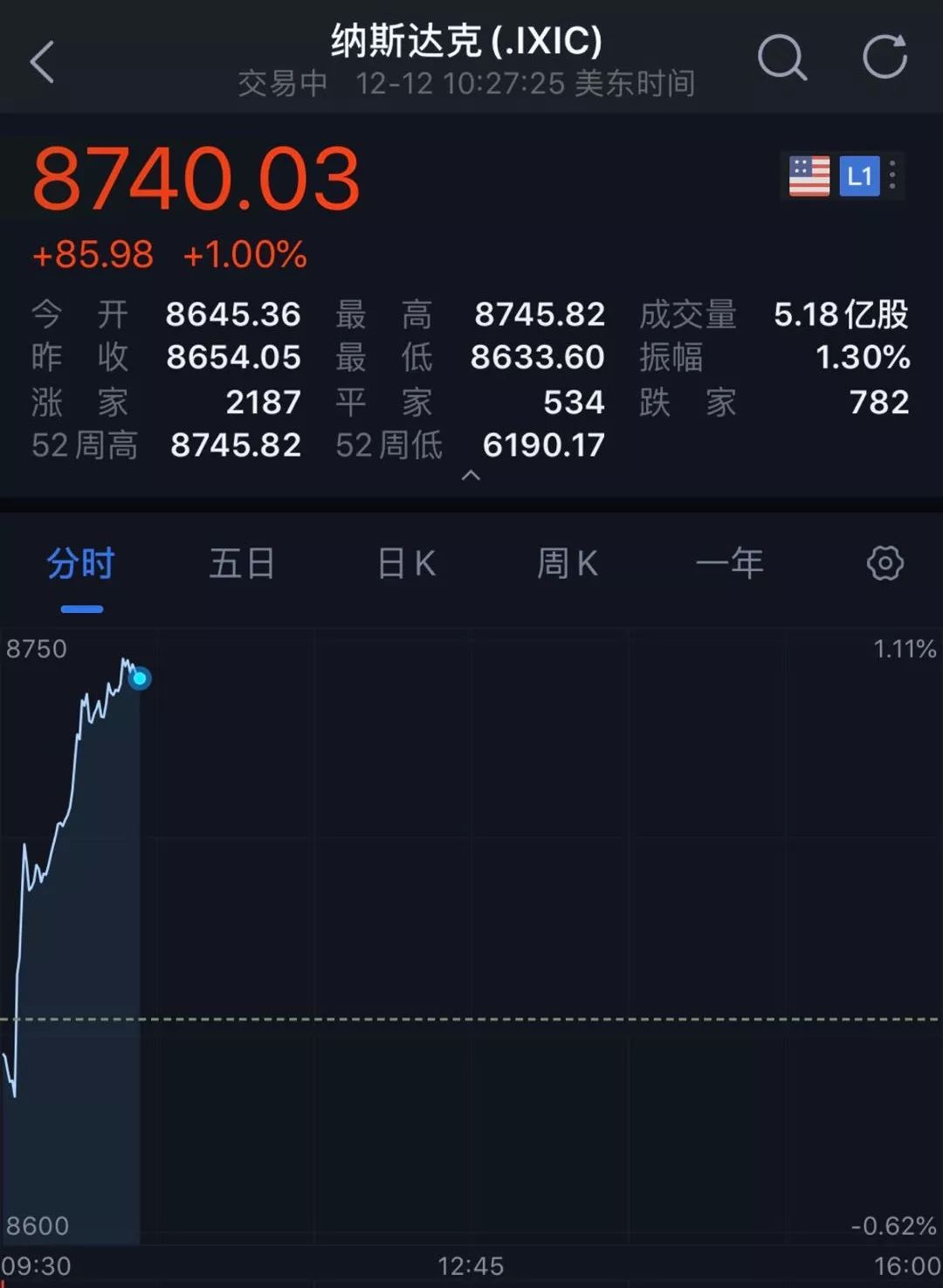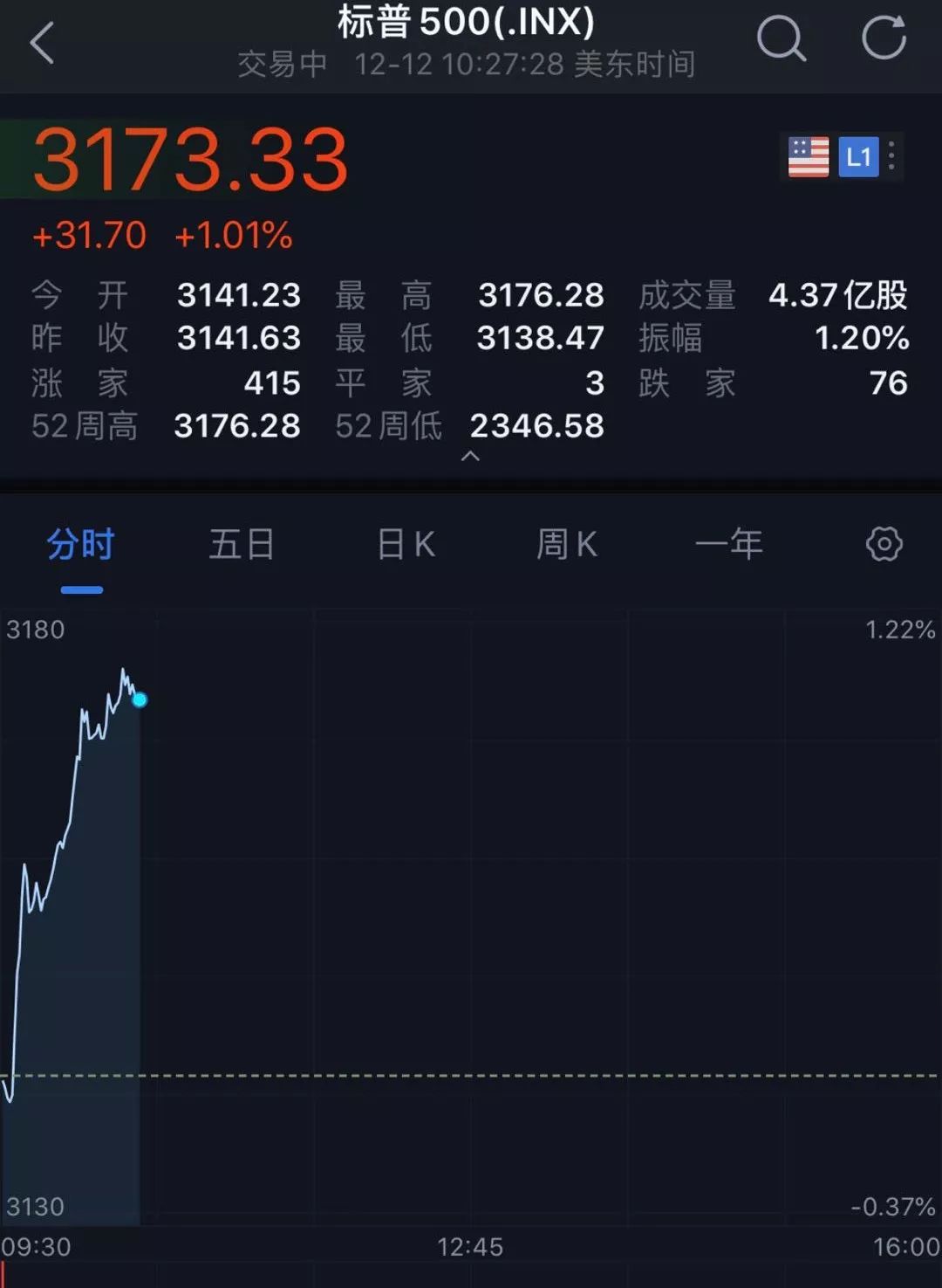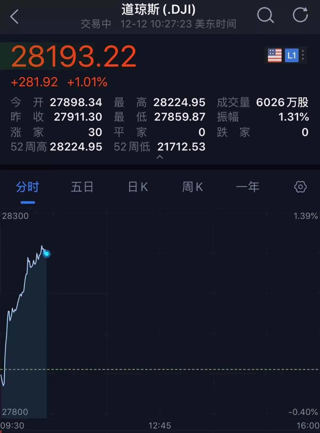 北京时间12月12日深夜,美股开盘时间,没有一点点的防备,美股三大指数一下就直线上涨了。