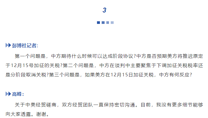 12月12日,商务部举行例行新闻发布会,新闻发言人高峰在回答中美经贸磋商相关问题时表示,双方经贸团队一直保持密切沟通,目前没有更多细节向大家透露。