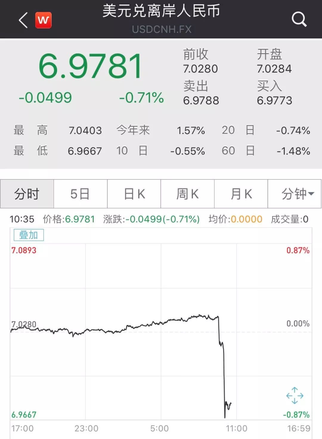 而离岸人民币汇率方面,直接收复7.0关口重回6时代,盘中一下子涨了600多点。