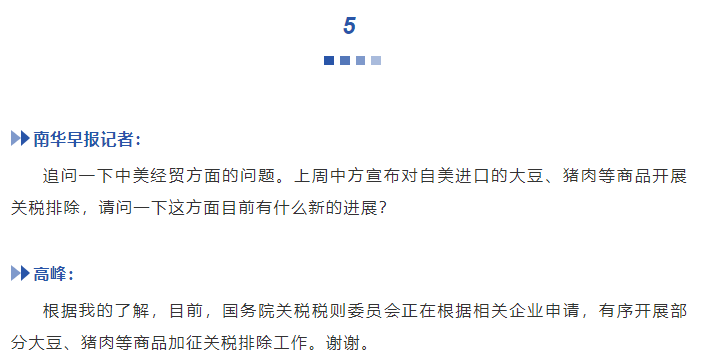 高峰还介绍,目前国务院关税税则委员会正在根据相关企业的申请,有序开展部分自美进口大豆、猪肉等商品加征关税的排除工作。