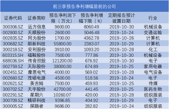 业绩增幅居前的公司中,还有一家刚刚上市的科创板公司传音控股。作为非洲手机市场之王,传音控股刚刚登陆科创板上市,公司预计前三季实现归属于母公司股东的净利润12.12亿元至13.48亿元,较去年同期(未经审计)同比增长约676.92%至764.10%。此外,公司近期颇受市场关注,在9月30日上市仪式上,传音控股董事长朱兆江回应华为起诉一事表示,相信法律会有公正回复。