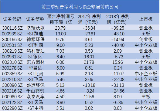 预告前三季净利润亏损超过亿元的公司超30家,15家公司预亏金额超3亿元,近半数为ST公司,还有部分创业板公司此前已连续两年净利润亏损。