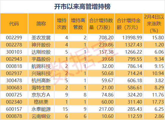 证券时报?数据宝统计显示,从增持金额看,节后增持金额最多的是圣农发展,累计增持708.2万股,增持金额合计1.4亿元;其次是神开股份,增持量为239.86万股,增持金额1327.43万元;达刚控股累计获高管增持1266.22万元,增持金额位居第三。