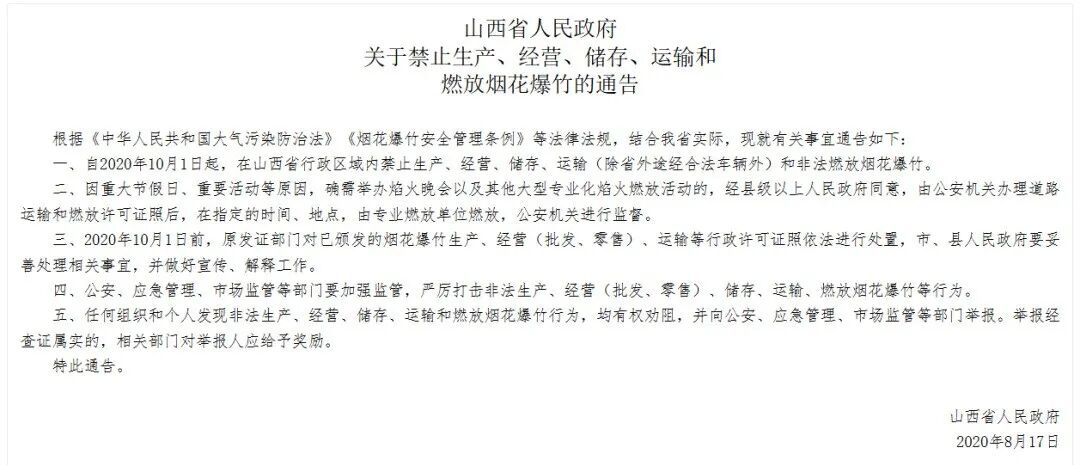 该通告曾表示,自2020年10月1日起,在山西省行政区域内禁止生产、经营、储存、运输(除省外途经合法车辆外)和非法燃放烟花爆竹。此外,因重大节假日、重要活动等原因,确需举办焰火晚会以及其他大型专业化焰火燃放活动的,经县级以上人民政府同意,由公安机关办理道路运输和燃放许可证照后,在指定的时间、地点,由专业燃放单位燃放,公安机关进行监督。