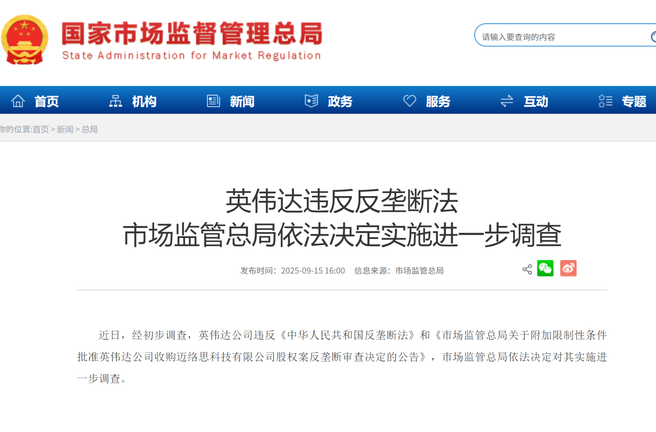 近日,经初步调查,英伟达公司违反《中华人民共和国反垄断法》和《市场监管总局关于附加限制性条件批准英伟达公司收购迈络思科技有限公司股权案反垄断审查决定的公告》,市场监管总局依法决定对其实施进一步调查。