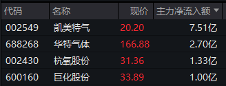 Wind实时监测数据显示,截至午间收盘,工业气体获得逾11亿元主力资金净流入,其中凯美特气、华特气体、杭氧股份、巨化股份4股获得超亿元净流入。