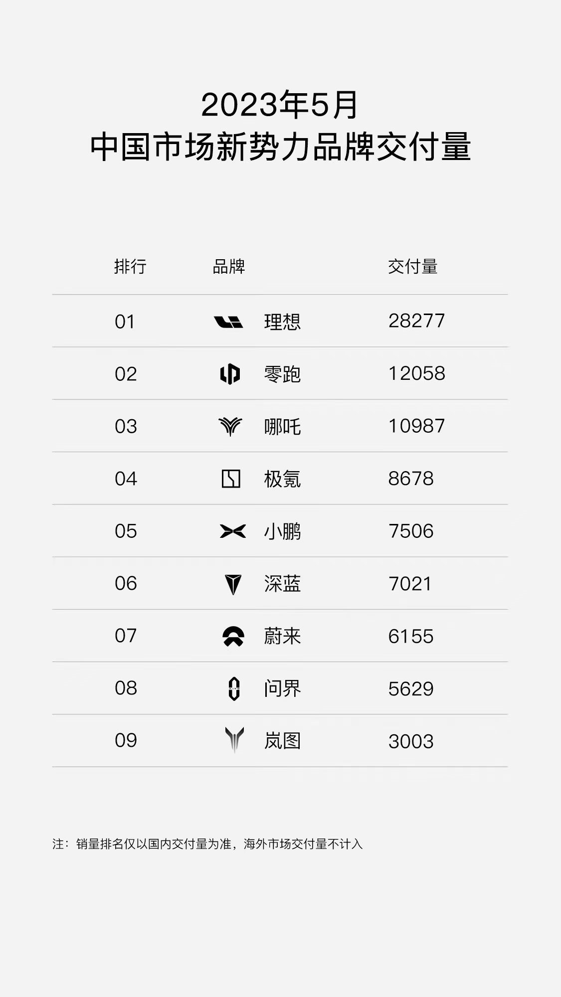 数据还显示,零跑汽车5月销量在新势力品牌中排名仅次于理想、哪吒,大幅领先小鹏的7506辆及蔚来的6155辆。