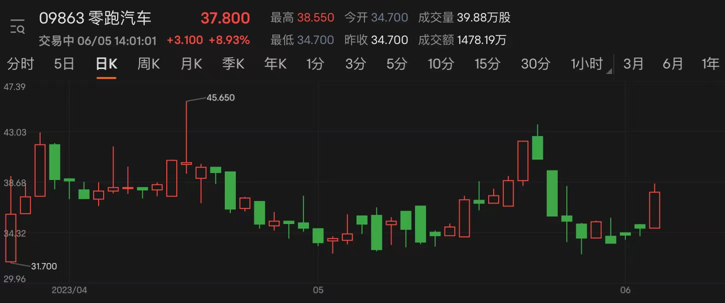 零跑汽车盘中涨近9%!五月销量过万大幅领先小鹏蔚来