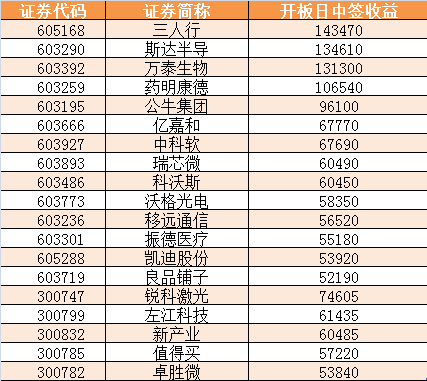 创业板申购的新股中,已开板的公司上市平均录得8.18个涨停,平均涨幅216%,单签获利超过5万元的公司包括锐科激光、左江科技、新产业、值得买、卓胜微,其中锐科激光单签获利74605元居首。