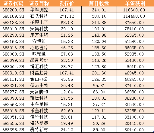 科创板个股上市首日平均涨幅150%,平均单签获利20177元。华峰测控、石头科技首日单签获利116300元和114490元,另外柏楚电子、安集科技、东方生物、安博通、心脉医疗、映翰通、晶晨股份首日单签获利超过5万元。博汇科技、财富趋势、金山办公、微芯生物等多只个股首日单签获利超过3万元。国盾量子单签获利远远打破了华峰测控、石头科技单签11万的纪录。
